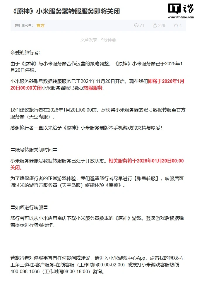IT之家 1 月 16 日消息,米哈游今日公告,由于《原神》与小米服务器合作运营的策略调整,《原神》小米服务器已于 2025 年 1 月 20 日停服。