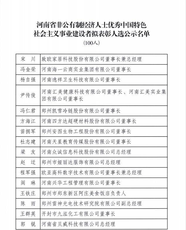 【大河财立方消息】据河南省市场监管局,经省委、省政府批准欧维策略,省委统战部、省工业和信息化厅、省人力资源社会保障厅、省市场监督管理局、省工商联共同开展“河南省非公有制经济人士优秀中国特色社会主义事业建设者”评选表彰项目。